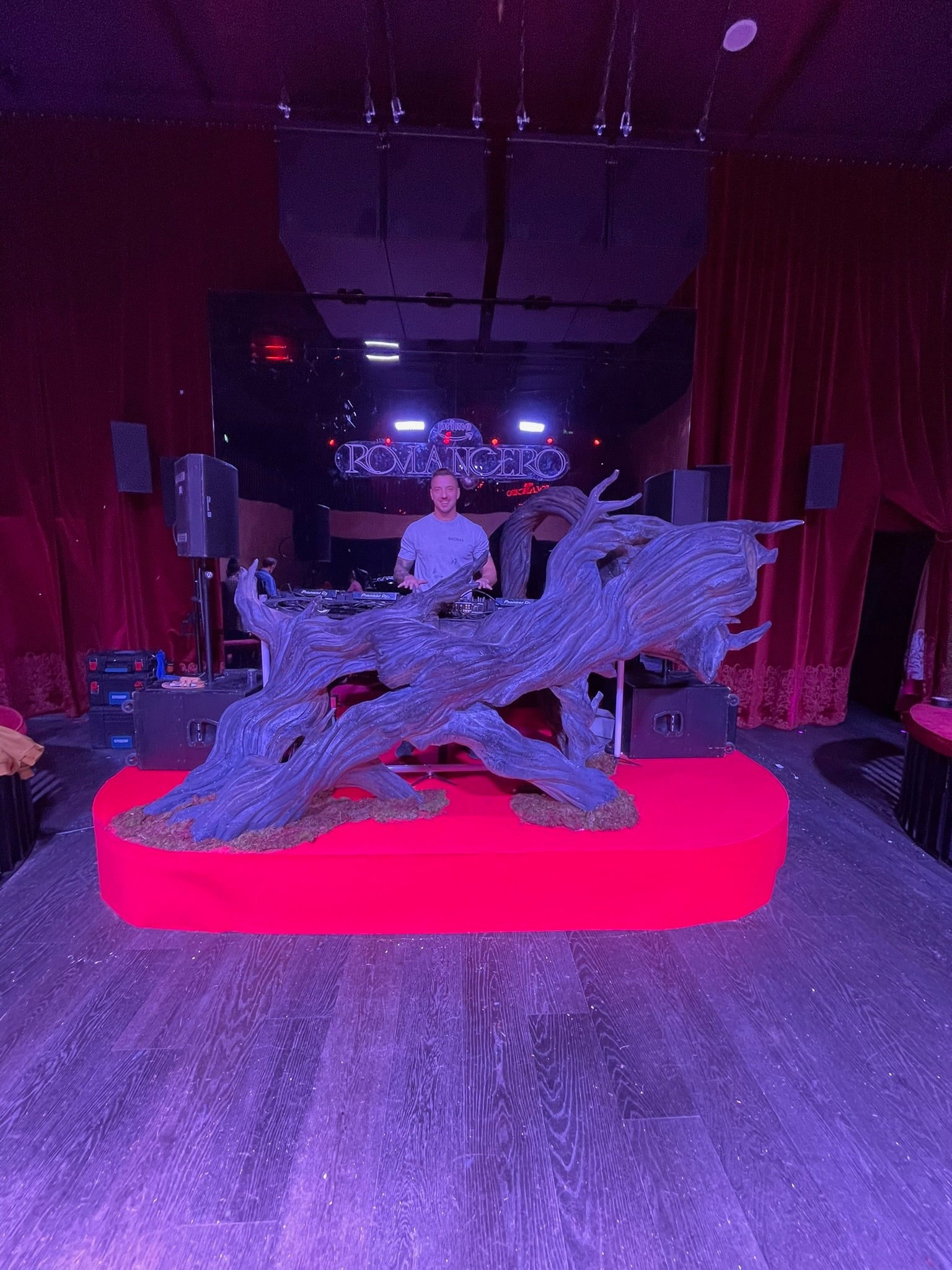 Para este proyecto realizamos una cabina de DJ personalizada para la premiere de la serie Romancero en Amazon Prime. El reto consistía en recrear una escena icónica de la serie: un tronco de madera de tamaño y forma específicos. Primero diseñamos un modelo 3D para reproducirlo con precisión y luego lo adaptamos para que se acoplara perfectamente a la mesa del DJ.